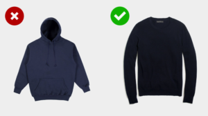 Let’s say your current go-to school outfit is basketball shorts and a navy hoodie. You can take that oversized, shapeless hoodie and step it up with a navy sweater instead.